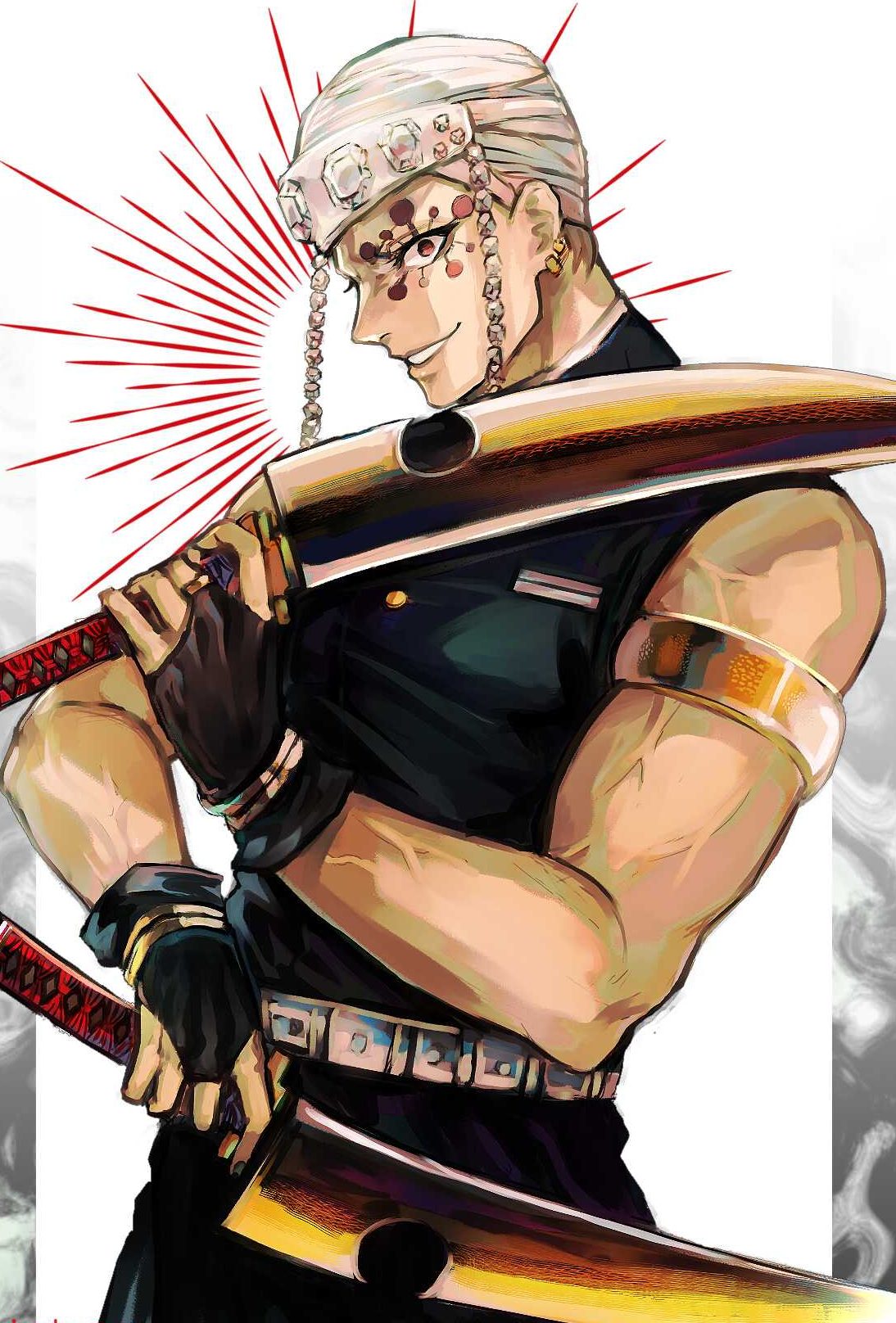 The current Sound Hashira former shinobi. He has three wives who work as scouts but is forced to quit the position after losing a hand and an eye in a battle against the Upper Ranks.